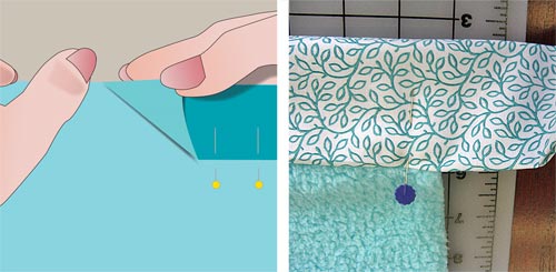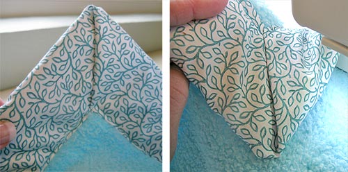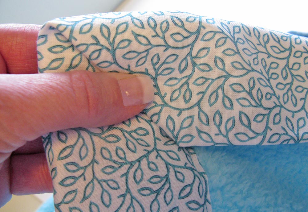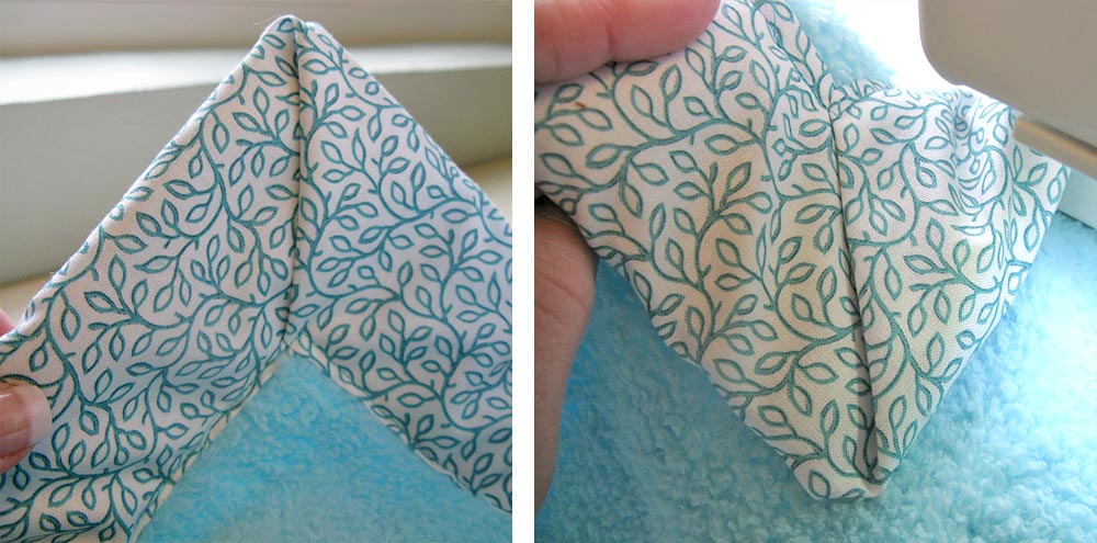 - Fold a pleat in the corner to make a neat 45˚ angle. Pin. Encase the new side’s raw edge with the binding, working your way to the next corner.