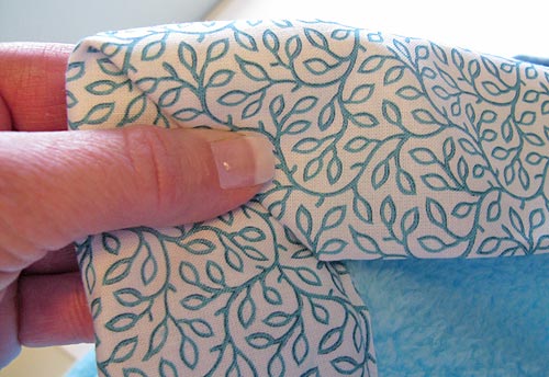 - When you return to your starting point, tuck under the raw edge of the binding, match the bottom edges and match your stitching line to finish. Press. IMPORTANT: DO NOT iron the Minky; just press the cotton binding.