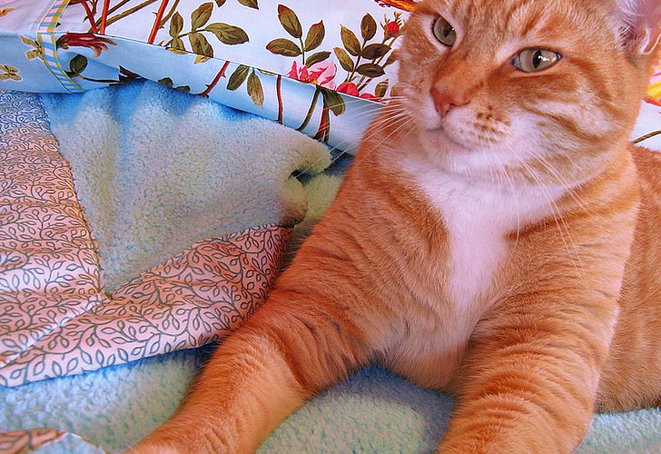 This easy bound blanket is nearly five feet square, providing plenty of cuddle room for all. In fact, our Official Cushiness Tester, Big Ollie the orange cat, certified it as worthy of non-stop pushy-pulley paw kneading and a ten on the purr-o-meter.