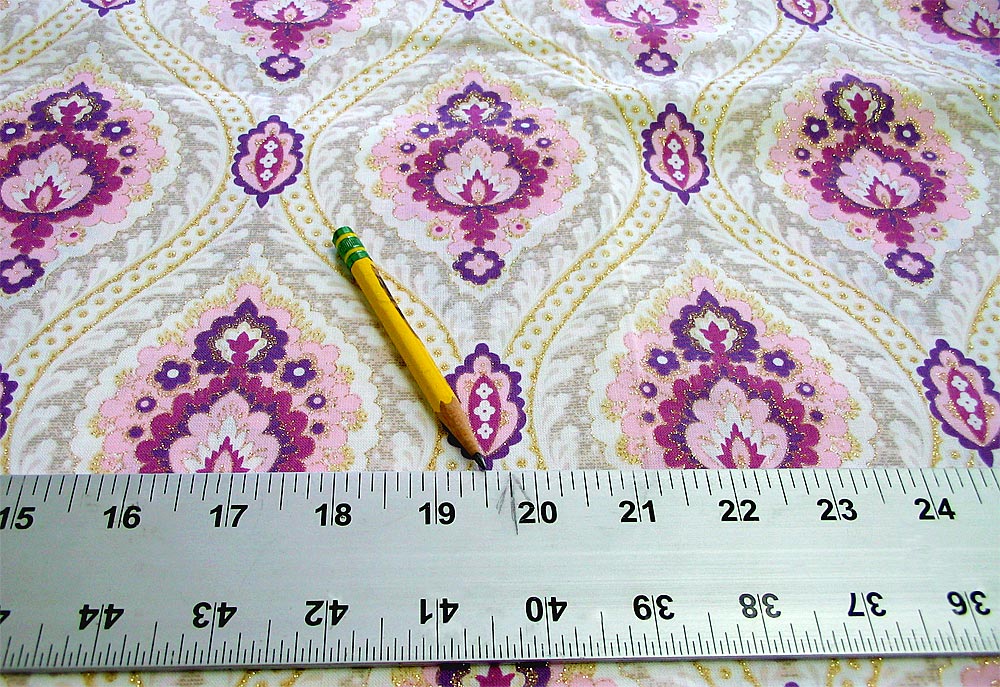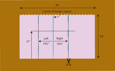 - First, find a center point of your design repeat with plenty of room to each side. Mark the point with a pin. Measure 19½” to the right and 19½” to the left of this center point.