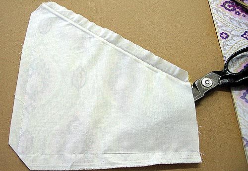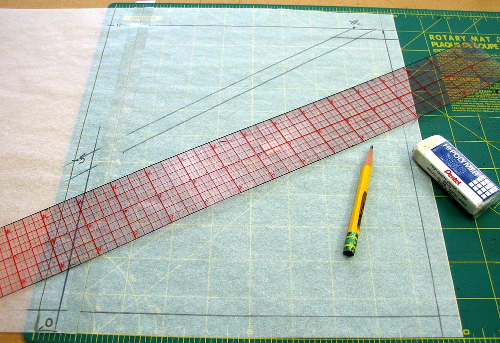 - Draw a diagonal line connecting these two marks. Then, draw another line ½” in from it to indicate the seam allowance.