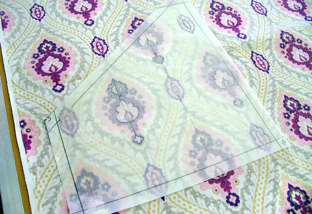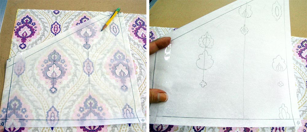 - Trace the fabric motif in a few key spots onto the tissue. We also marked a vertical line through the pattern to help us keep everything straight.