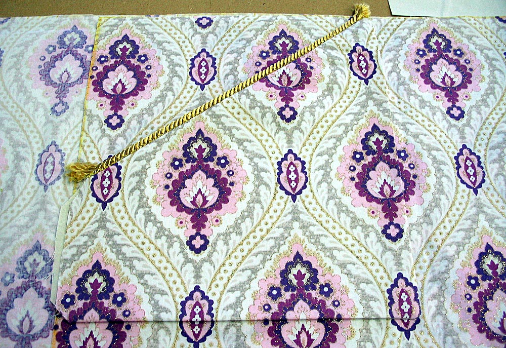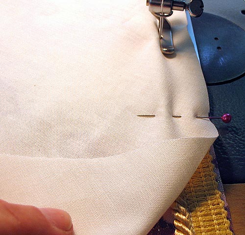 - Place the lipped cord along the angled cut of the pocket. Cut to fit; the cord should extend just a bit beyond the fabric on each end. The edge of the ‘lip’ – called a flange, should align with the raw edge of the fabric. Pin in place.