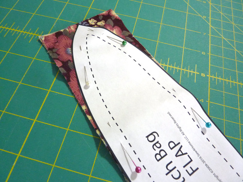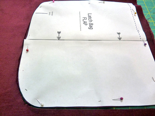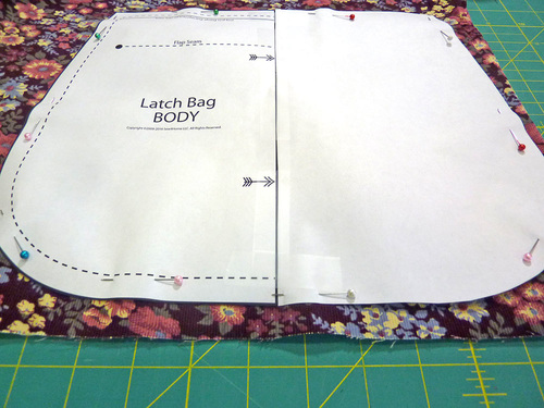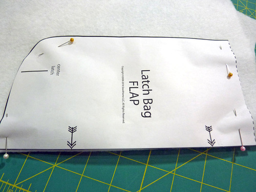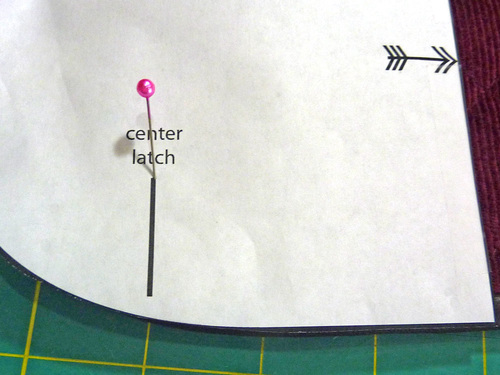 - Place the original pattern piece on top of the finished flap. Place a pin at the Center Latch vertical marking.
