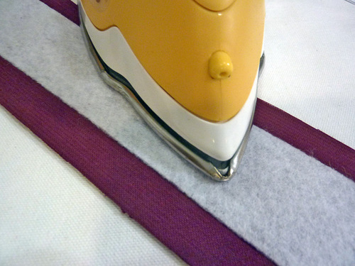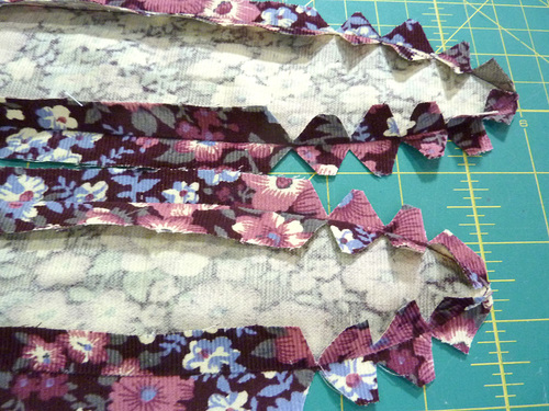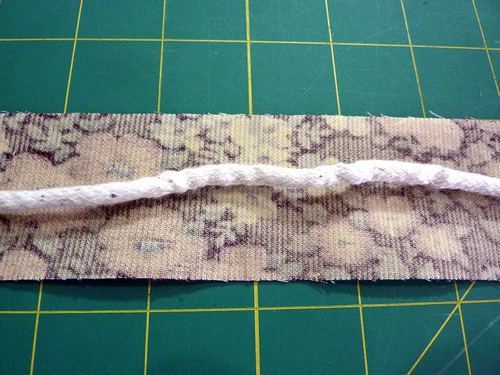 - Place the piping down the center of the wrong side of each strip.