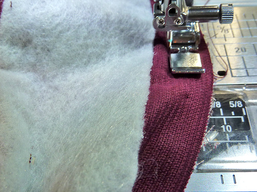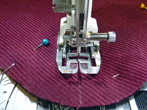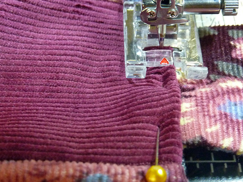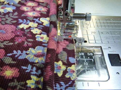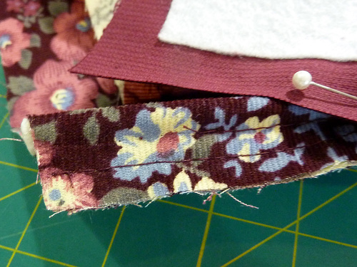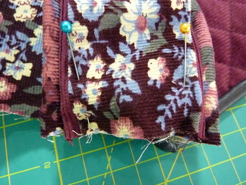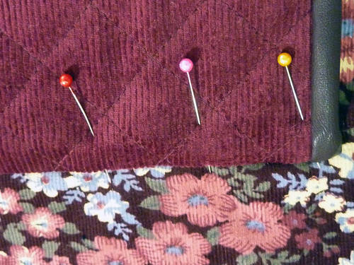 - Unlatch and stitch the bottom halves into position in the same manner as for the top halves. You are stitching through the corduroy exterior and the fusible fleece.