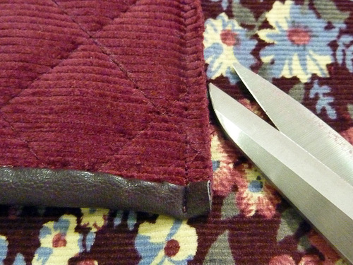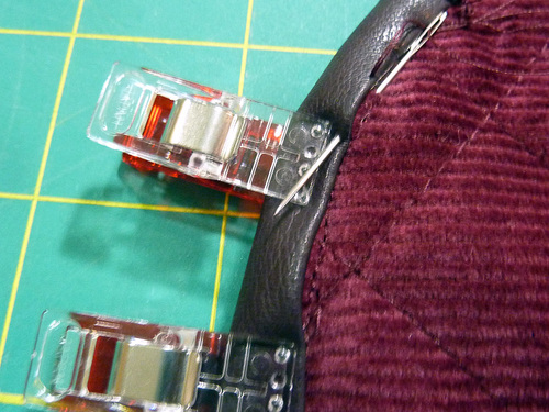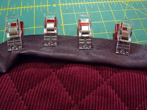 - Fold up the flap along the seam line. You may need to futz with the binding a little at the outer edges to get a smooth fold. Since the faux leather doesn’t ravel, you could even trim it at a bit of a diagonal to keep it from showing along the edge. We had no trouble with our binding and simply stitched in place and then folded up along the seam. Pin the flap in this “up” position.