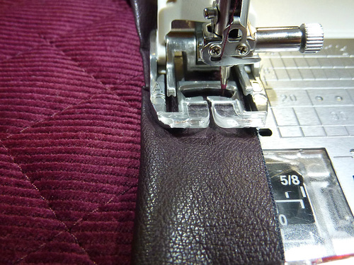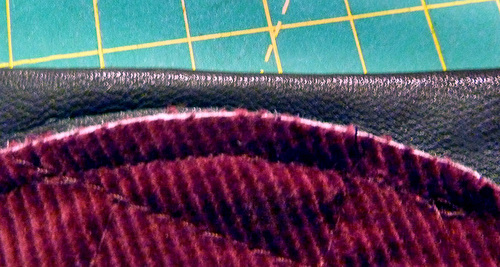 The edge of the flap is bound with a thin strip of faux leather. This adds another subtle texture and increases the stability of the flap along its outer edge. We selected a thin garment faux leather. You want something that is easy to manipulate with a bit of stretch so you can create a smooth edge all around.