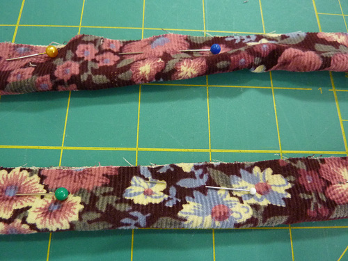 - Find the two strips of piping fabric and the two lengths of piping cord.