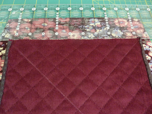 - To create the diamond quilting pattern, use your clear ruler and a fabric pen or pencil to draw a diagonal line from one top corner across the panel and ending at the opposite bottom curve of the flap.