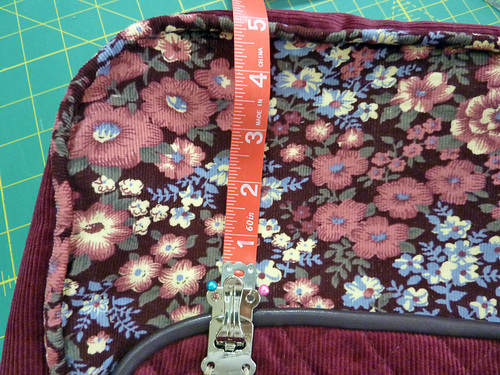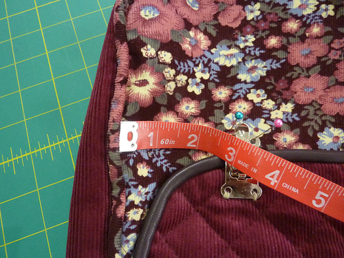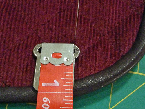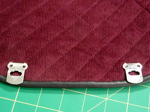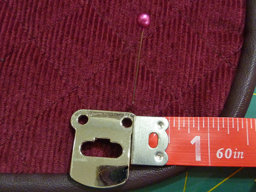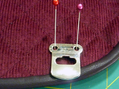 - Check again that the flap is laying flat and centered and is not too taut across the top. Then as you did above, place a pin through each hole in the bottom half of the latch. Our positioning was 5” up from the bottom piping on the bag…