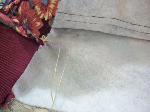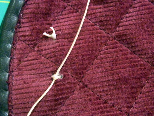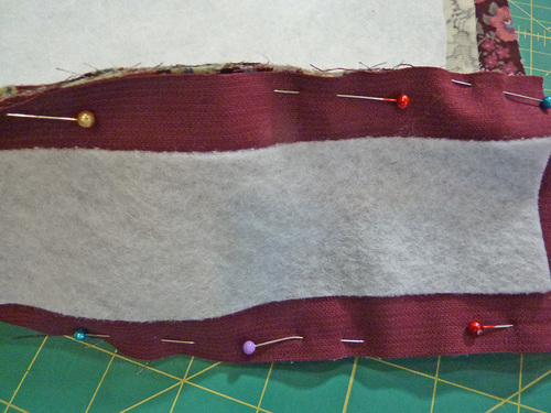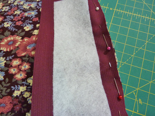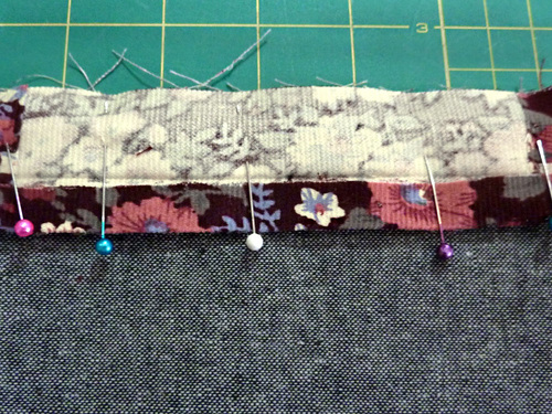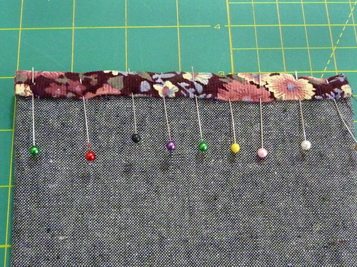 - Place the “empty” piping against the panel and re-pin. By removing this little bit of piping at the top it will make all the layers come together during the final steps more easily and with less bulk.