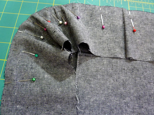 - Place the side panel right sides together with the front exterior panel. Start at one top corner of the panel and pin down, around the curved bottom of the panel, and back up to the opposite top corner. As you did with the piping, you can clip the side panel to ease it around the curved corners.