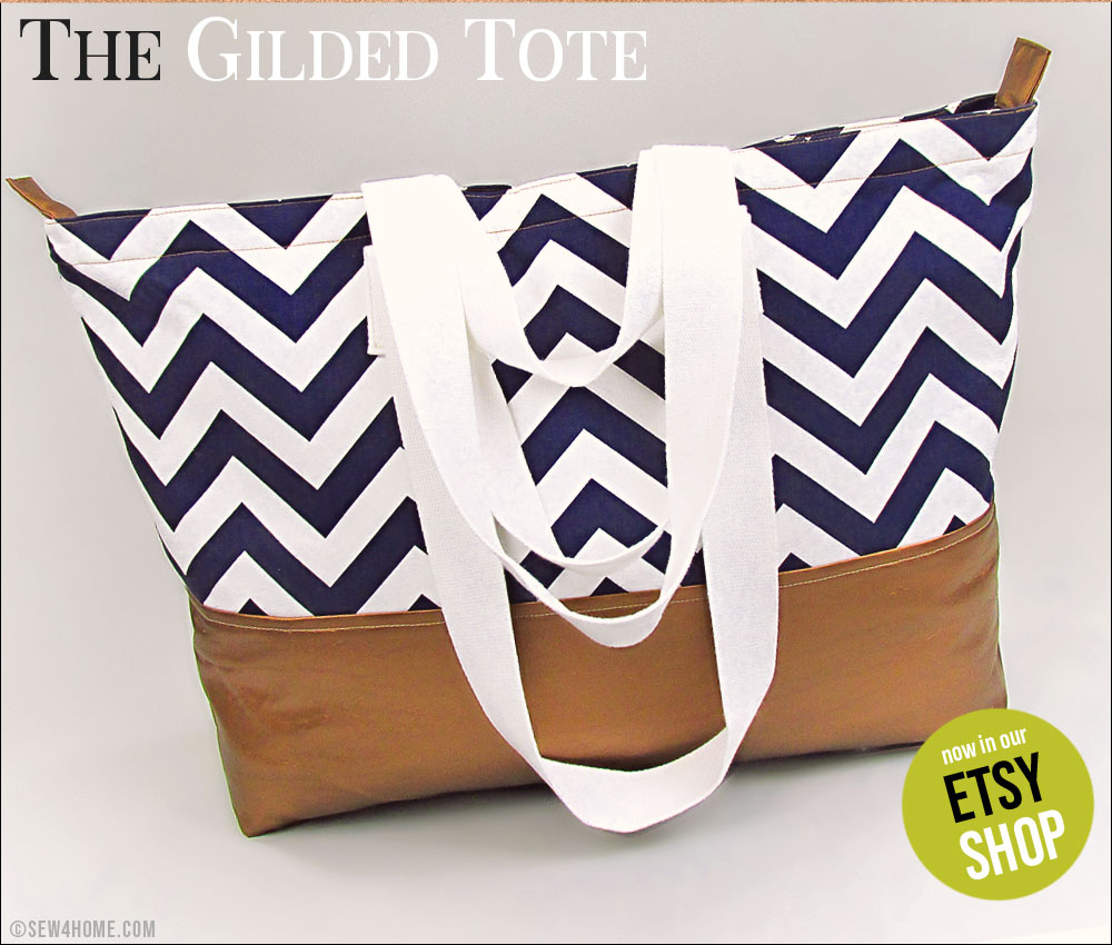 The bold combination of graphic chevrons and a metallic faux leather is a winner that works year ‘round. As always, the final fabric choices are yours, but a strong blend of motifs and textures is the mark of designer bags you find in boutiques for top dollar. You can make it your own and make it for less.