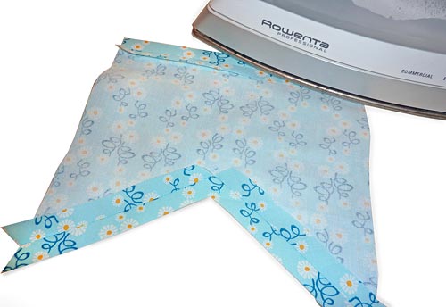 - The final step of the ties is to make two pleats in the raw ends of each organza tie, bringing the sides of the tie in to the center so the organza tie is now the same width as the finished waistband or 1½”.