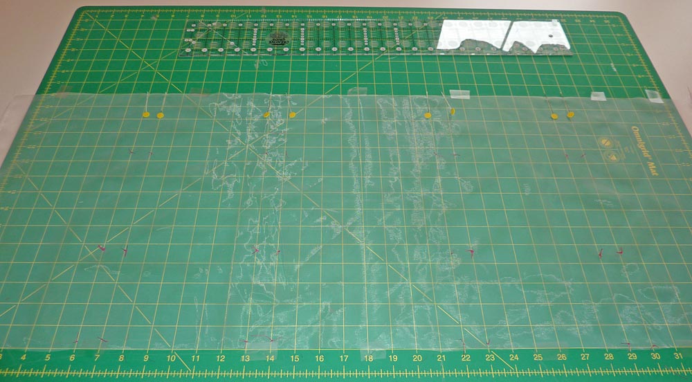 - The pockets should sit exactly between the top and bottom rows of marking. Pin the pockets in place.