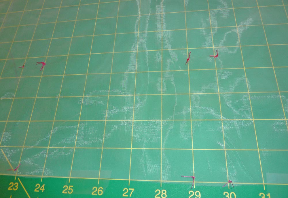 - Once you have all your marking pins in place, go back through with a hand sewing needle threaded with brightly colored thread and make a tiny knot at each pin. Then remove all the pins.