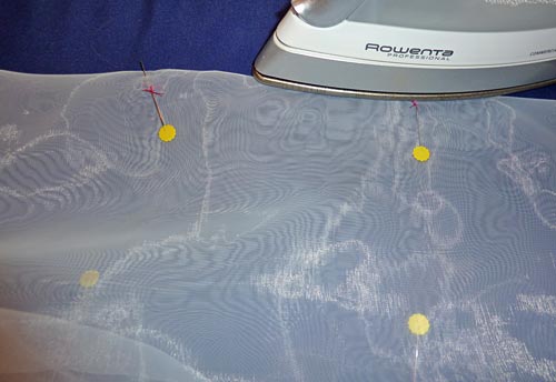 - Pinch and fold the organza at each of the four pairs of close-set markings. Each of these marks are 1″ apart, so when you bring them together you are creating a ½” fold. Pin these four folds in place.