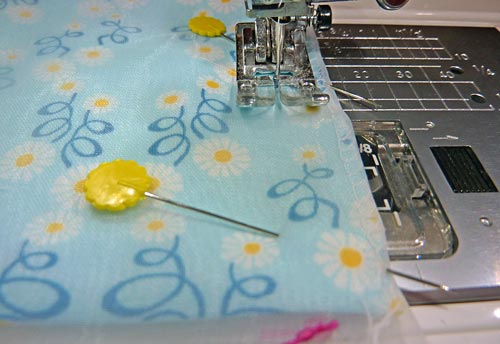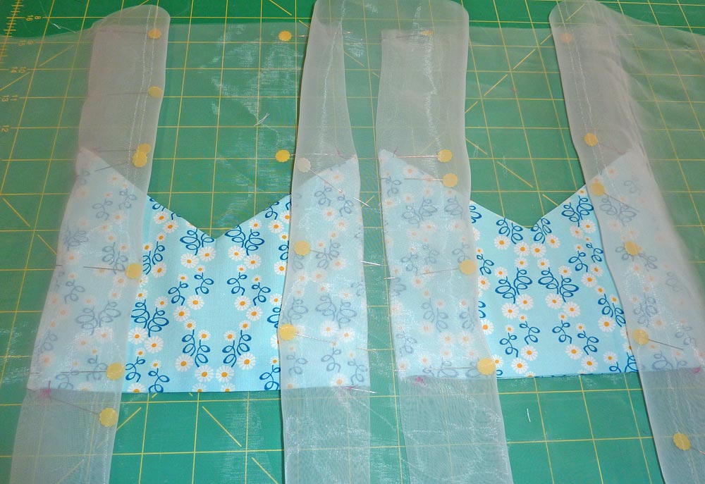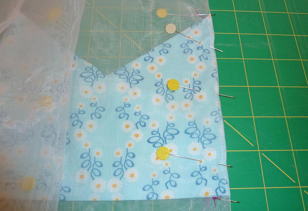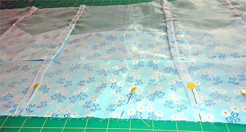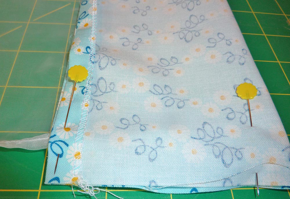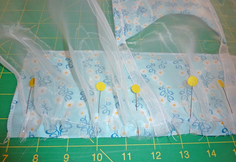 - Pin the 37″ raw edge of the border strip, right sides together to the bottom raw edge of the organza skirt.