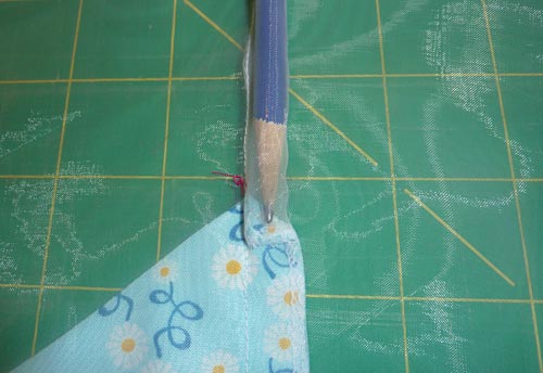 - The tip of the pocket showed through so we took a long, sharp pencil and very gently eased it into the seam from the top, pushing the pocket point toward the bottom of the pocket.