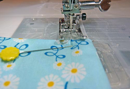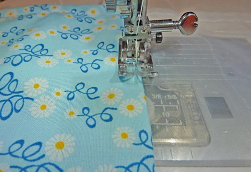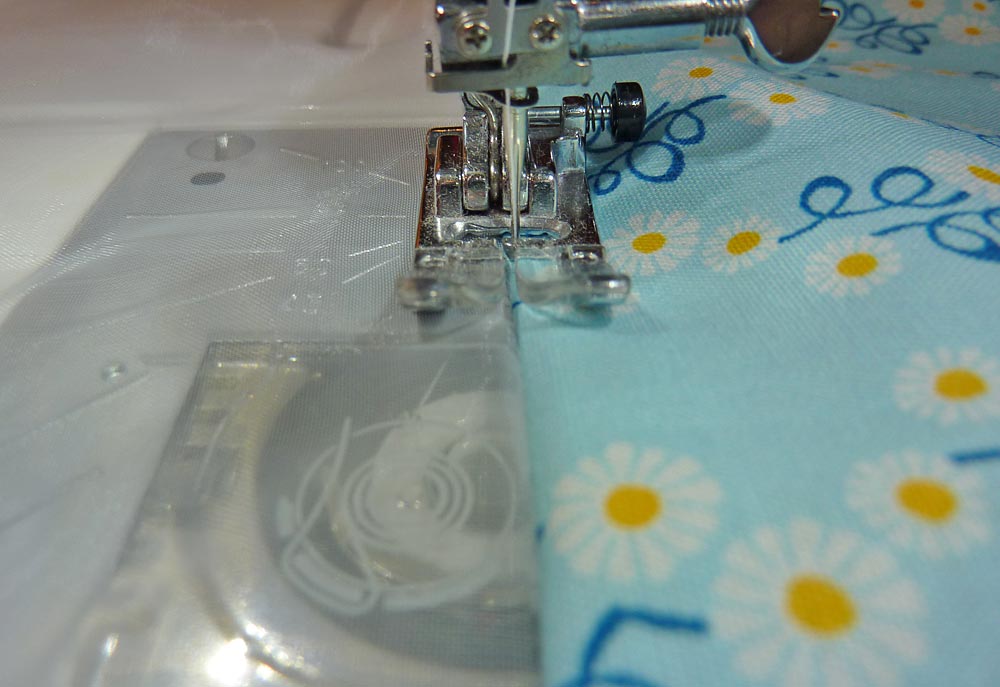 NOTE: Some Janome machines have an automatic cloth guide, which is a very cool way to create a guide to keep your seams straight. You can also run a piece of bright blue painter’s tape across your stitch plate at the ½” line to give yourself a bolder edge to follow. - Finally, edgestitch along the bottom of each pocket.