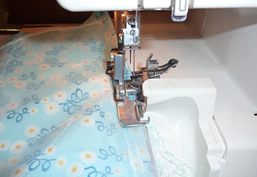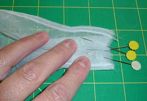 - Make a narrow double-turn hem on both 15″ sides of the 15″ x 41″ organza skirt.