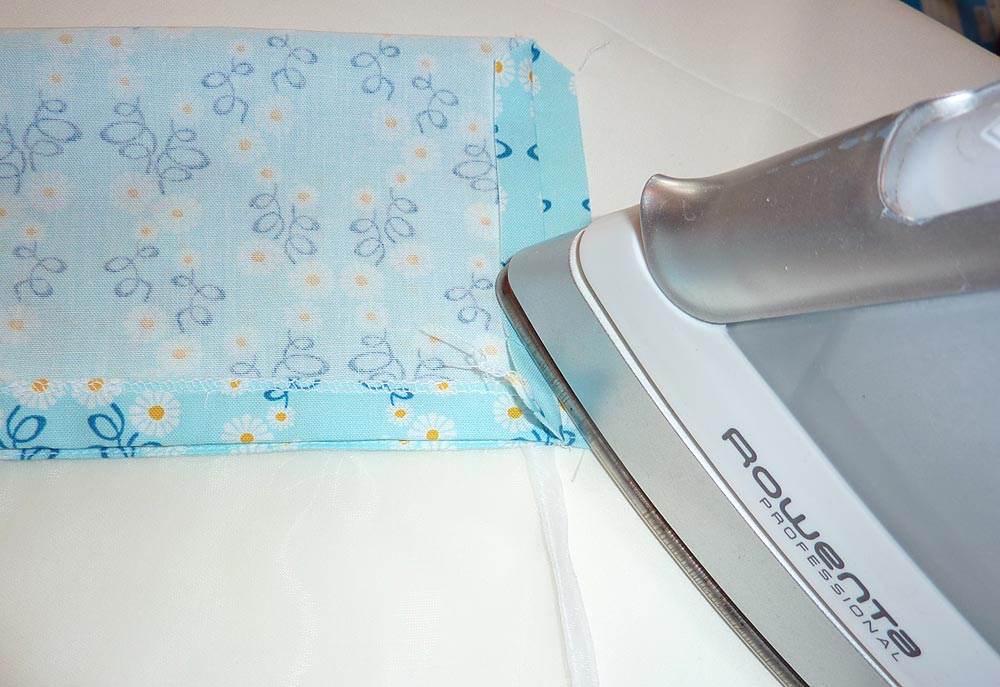 - Turn the border right side out and press well. The finished and folded edge should perfectly cover the organza/cotton seam from the back.