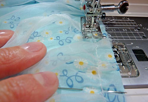 - Run a gathering stitch along the top of the organza skirt. To do this, stitch one line of machine basting approximately 3/8″ from the top raw edge.