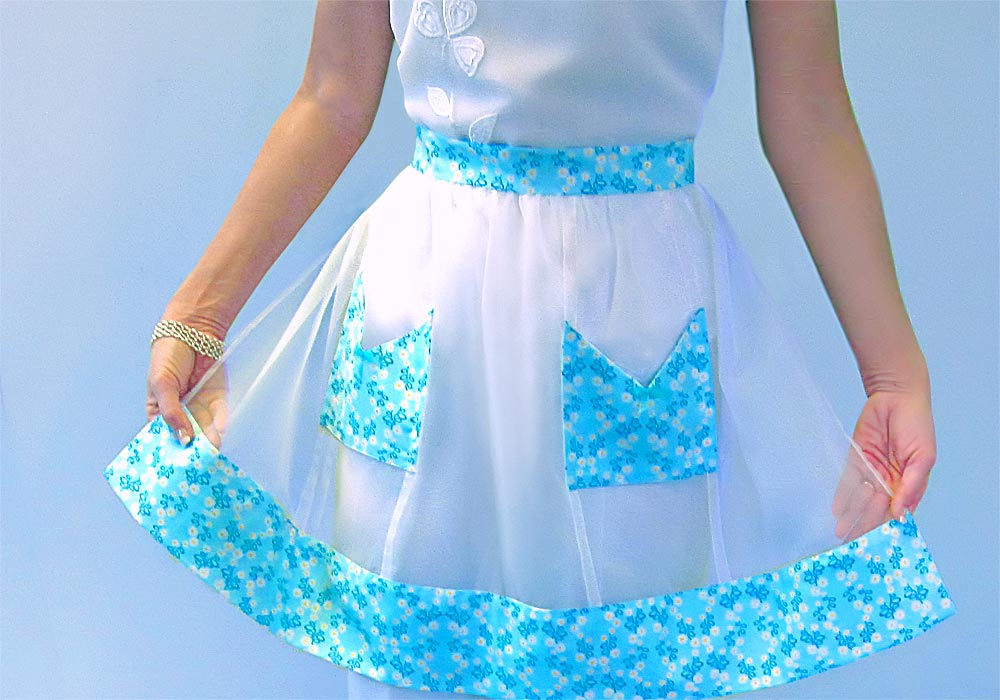 Shall we sit and have a sip, and chat about our chums? The third in our series of retro hostess apron tutorials is the sheer magic of Let’s Do Brunch. Like the perfect brunch blend of steaming coffee and sticky cinnamon buns, this lovely hostess apron mixes wispy organza and crisp cotton into a delicious design. Its beautifully transparent skirt features four French seams plus accents at the waistband, bottom border and pockets in the fresh, floral Pick A Bunch print from Robert Kaufman Fabrics.