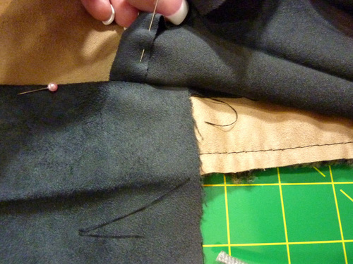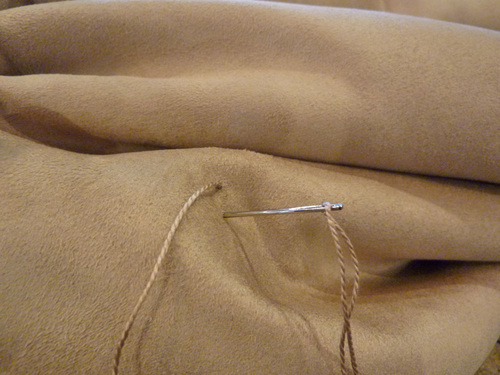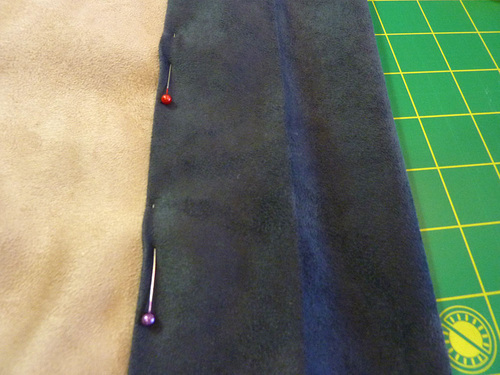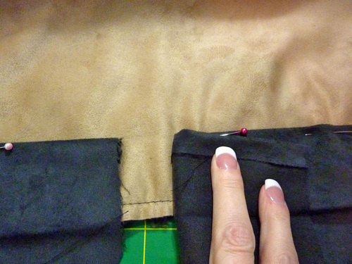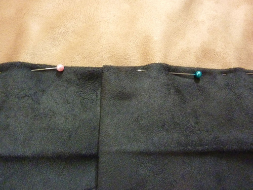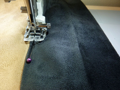 - Pin in place all around along the one folded edge that is laying on the faux suede.