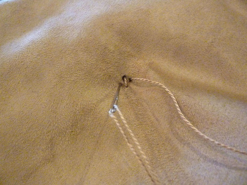 - Heavy embroidery floss or thin yarn for the ties in a color to best match the suede backing; one – two small skeins