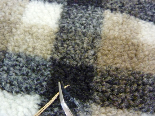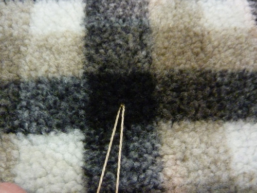 NOTE: As shown in the drawing above, our 24 ties are set onto the intersecting lines of the Berber Check, using the bolder charcoal gray lines as the grid. Following this more prominent color allows for the most consistent and easy spacing, but it does mean the floss, which is matched to the color of the faux suede backing, will slightly show on the front against the dark gray. We show you below how to trim closely to best hide the ties within the nap. If you’d prefer to leave your ties longer on the front, you can choose to place your ties within a color on the check that more closely matches the suede backing. - Thread the chenille needle (or similar large-eyed needle) with an approximate 18″ length of embroidery floss or yarn.