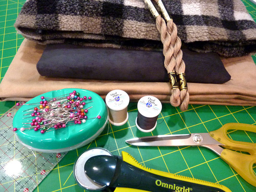 - 1¾ yards of 54″+ wide Berber Check Sherpa Style faux fur for the front; we originally used 58/60″ Sherpa Berber Check in Taupe from Shannon Fabrics