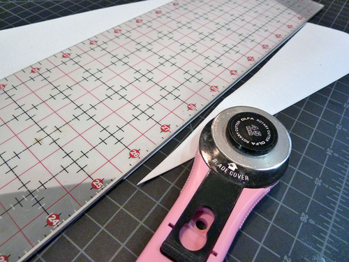 - Place a clear ruler from the side point to the center point, creating a diagonal edge to follow. Using a rotary cutter, slice along the diagonal.