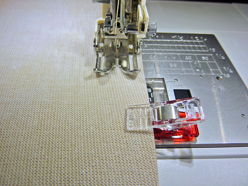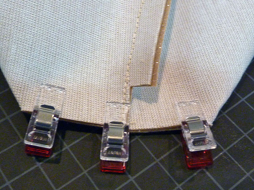 - Starting at a side seam, slip the binding over the top raw edge. That slightly longer side of the binding goes to the inside, against the lining. To maintain an even fold, just unclip a few inches at a time. Unclip the fold, then re-clip in place over the top raw edges.