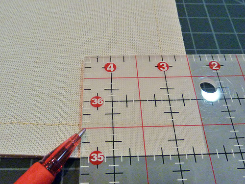 - From the upper raw edge, measure down 4″ along each side. Mark these side points.