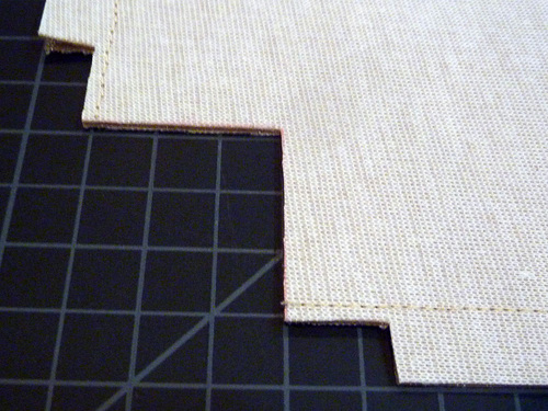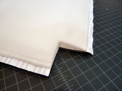 - Cut out the corner boxes. To reduce the bulk of the vinyl in the corner, trim away an additional ¾” along both the side and bottom, leaving a ¼” seam allowance from the original side/bottom seam. Your corner will have a bit of a stair-step look.