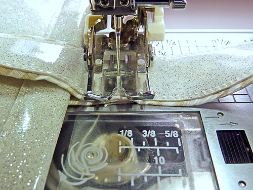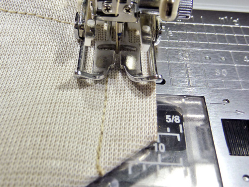 - Re-set the stitch length to normal. Using a ½” seam allowance, stitch along both sides and across the bottom, pivoting at the corners. We continued to use our Even Feed foot.