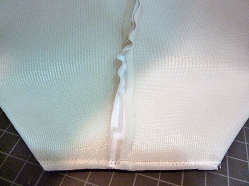 - Find the plastic canvas (or heavy interfacing rectangle). Drop it into place at the bottom of the bag.