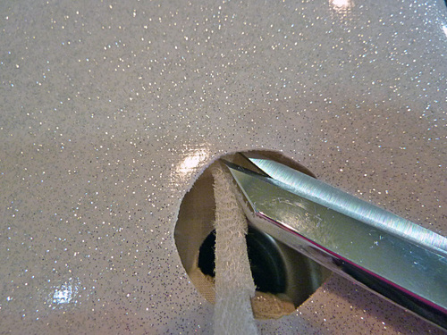 - Cut out the circle through all the layers. Then carefully separate the vinyl and lining and trim back just the foam ⅜” – ½” from the original cut circle. This is necessary to reduce bulk so the grommet will fit and can easily snap shut.