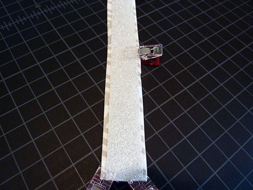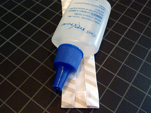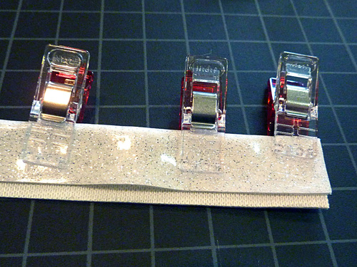 - Place a ¾” vinyl strap down the center of each folded fabric strip, covering the raw edges of the fabric. There should be only about 1/16″ of fabric showing to either side of the vinyl as well as at either end. Clip in place the length of the strap.