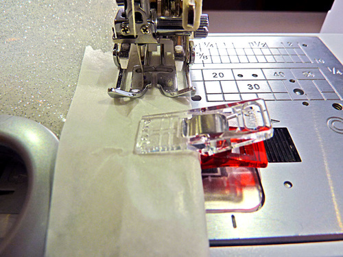 - Using a Walking foot, Teflon® type foot or a layer of parchment paper, topstitch along the “V” through both layers. The topstitching should run about ⅛” from the diagonally cut edge of the upper panel within the upper panel.