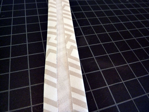 NOTE: If your interfacing is wider, you may be able to cut two ¾” x 34″ strips of interfacing. If so, you can simple center one strip on each strap. - Fold in and press the long raw edges of each fabric strip towards the center. One side should be pressed in ½” and the other side should be pressed in ⅜”. The finished width of the fabric strip should now be ⅞”.