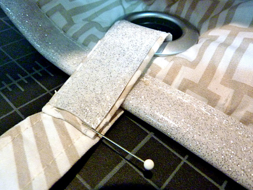 - Find the two lower 18″ x 16½” vinyl panels (sparkle taupe in our sample). Place one panel right side up and flat on your work surface. Place a “V” cut upper panel right side up on the lower panel. Align the top raw edges and the side raw edges of both panels. The finished height and width should be 18″ x 16½”. Clip the panels together.