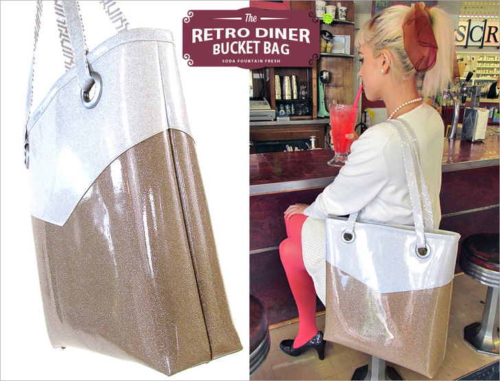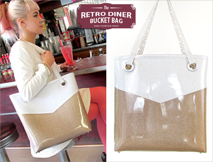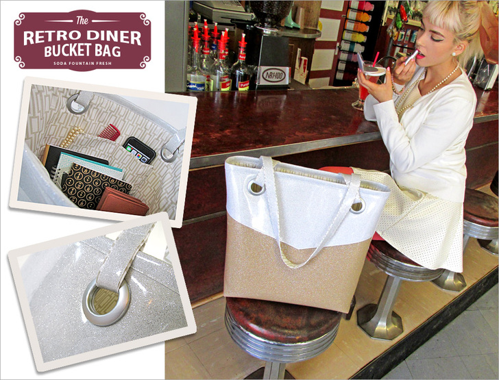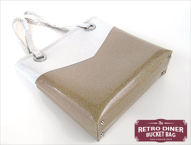 Fashion buzzwords in the mid-fifties were “shape” and “sheen.” We checked-off “shape” with a chunky 4″ boxed bottom in combination with big round grommets to hold the handles. And of course, the sparkle vinyl fabric wraps up “sheen” with the perfect retro look. We chose two of the most popular colors of the time period: ivory and taupe.