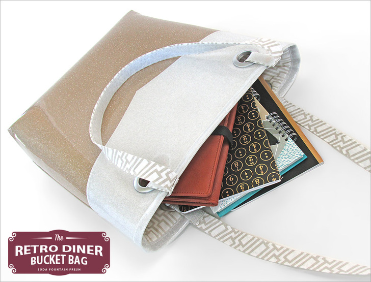 It’s a fabulous fifties flashback with a modern twist. Our Diner Bucket Bag is retro cool but with current features that make it easier to construct and stylish to carry – even without the perfect sweater set and pearls. The bag has a great structured shape thanks to the Pellon Flex-Foam behind the classic sparkle vinyl exterior.