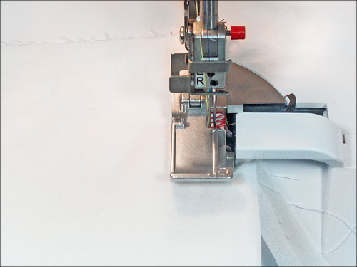 When overcasting an edge, you simply skim the raw edge of the fabric with the knives to create a smooth, finished edge.