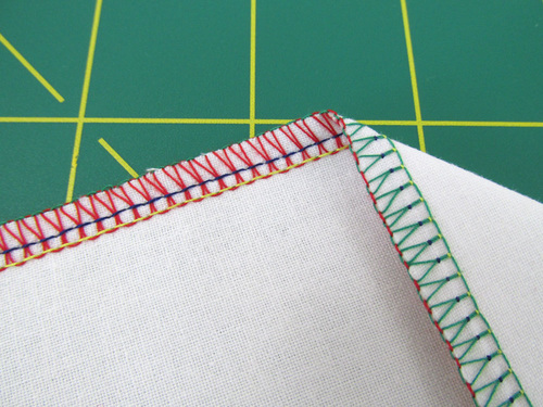 This stitch is called a 4-thread safety stitch and it can be created on all sergers. A perfectly balanced stitch has the upper looper thread (red in our sample) and lower looper thread (green in our sample) meeting right along the edge of the seam, while the needle threads (yellow and blue in our sample) lay perfectly flat on the upper looper side and are barely visible on the lower looper side.