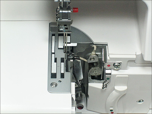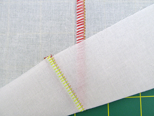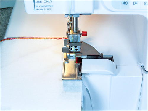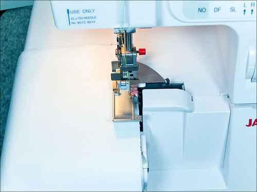 The stitch finger that the overcast stitches have been forming on is removed. The machine is then set up with one needle and thread in both loopers. The stitch length is shortened to .5mm-1mm, and the lower looper tension is tightened. Your manual will show you how to do all of this and will give you recommended settings; it’s not hard!