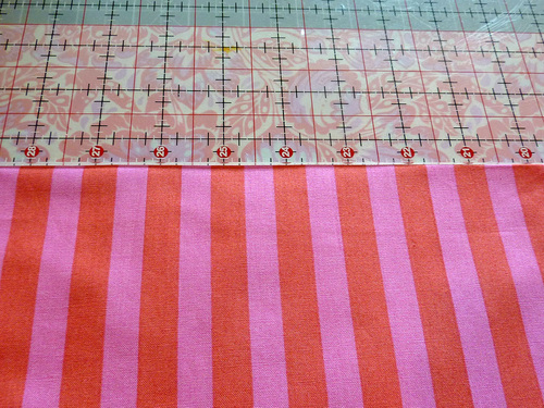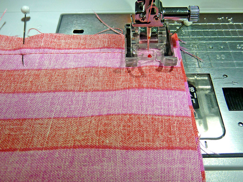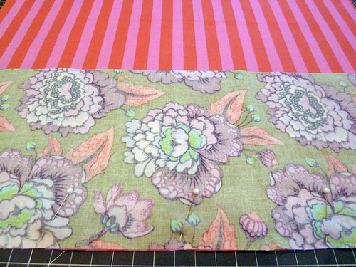 - Pin a bottom panel to a top panel along one 18″ edge. If your fabric is directional, make sure you are pinning the bottom raw edge of the top panel to the top raw edge of the bottom panel.